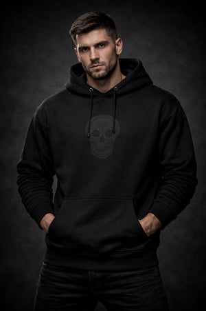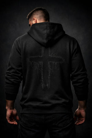 The skull on the front represents awareness: of time, of consequence, of self. Placed quietly, it serves as a reminder rather than a warning. The cross on the back is distressed and subdued, almost hidden—visible only when light and movement allow it. This is deliberate. Faith is not always meant to be broadcast.