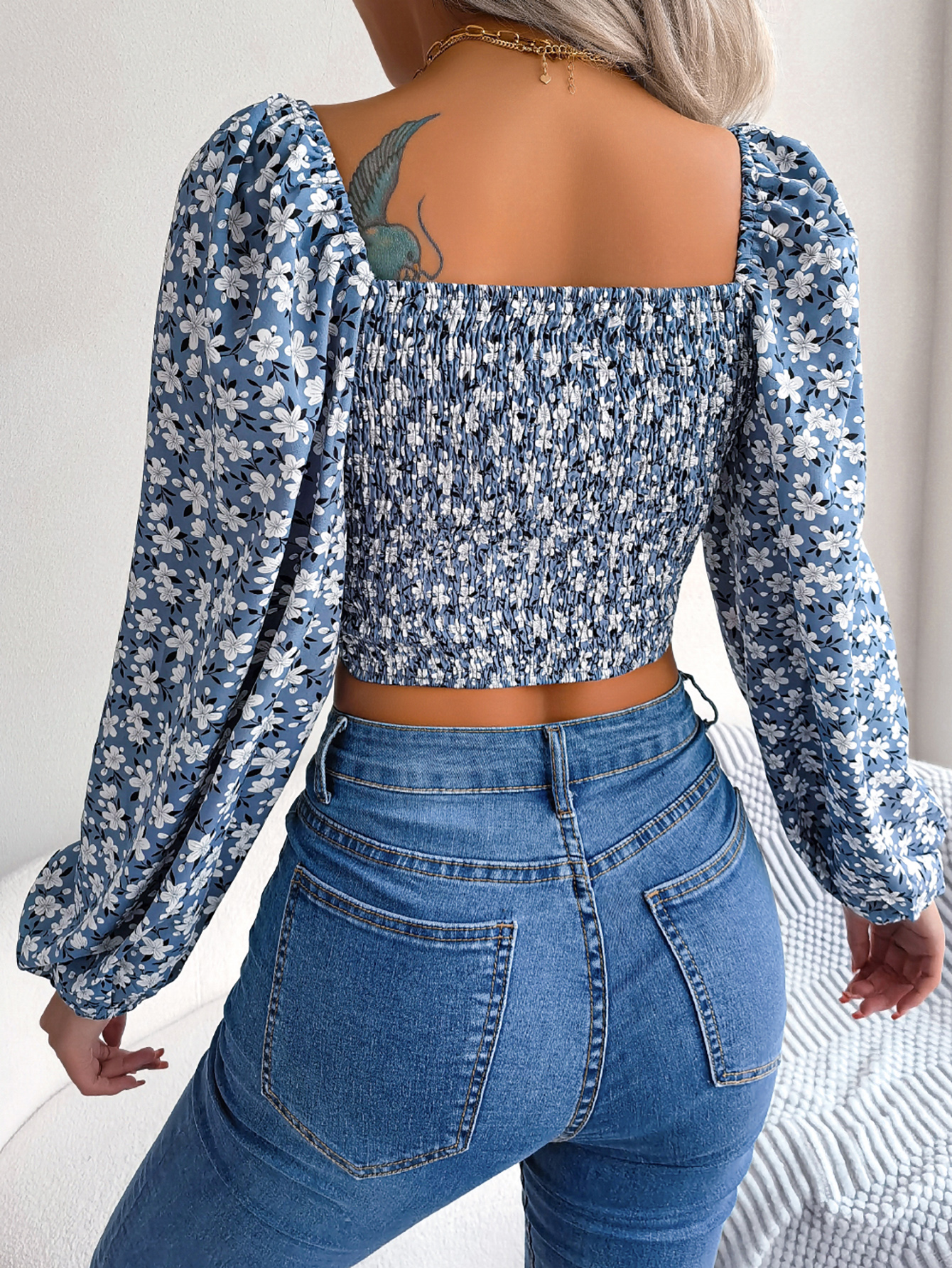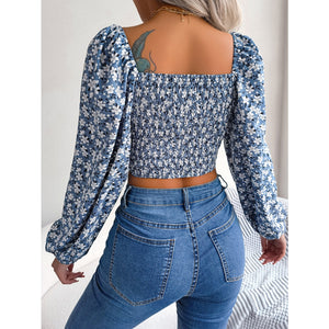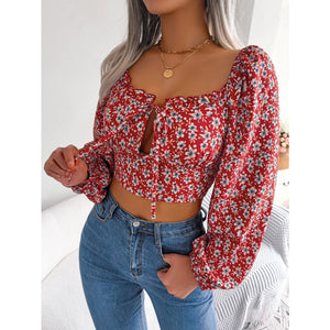 Women Sexy Ruffle Trim Tie Floral Print Chiffon Crop Top